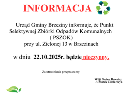 Aktualności 21.10.2025📢 Informacja o zamknięciu PSZOK w dniu 22 października 2025 r.Urząd Gminy Brzeziny informuje, że w dniu 22 października 2025 r. (środa)Punkt Selektywnej Zbiórki Odpadów Komunalnych...