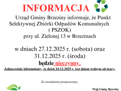 Aktualności 19.12.2025Zmiana godzin funkcjonowania PSZOKUrząd Gminy Brzeziny informuje, że Punkt Selektywnej Zbiórki Odpadów Komunalnych (PSZOK) zlokalizowany przy ul. Zielonej... -