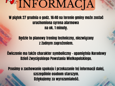 Aktualności 23.12.2025Informacja o treningu systemu alarmowania – 27 grudnia 2025 r.Urząd Gminy informuje, że w dniu 27 grudnia 2025 r. (piątek) o godzinie 16:40 przeprowadzony zostanie trening systemu wykrywania... -