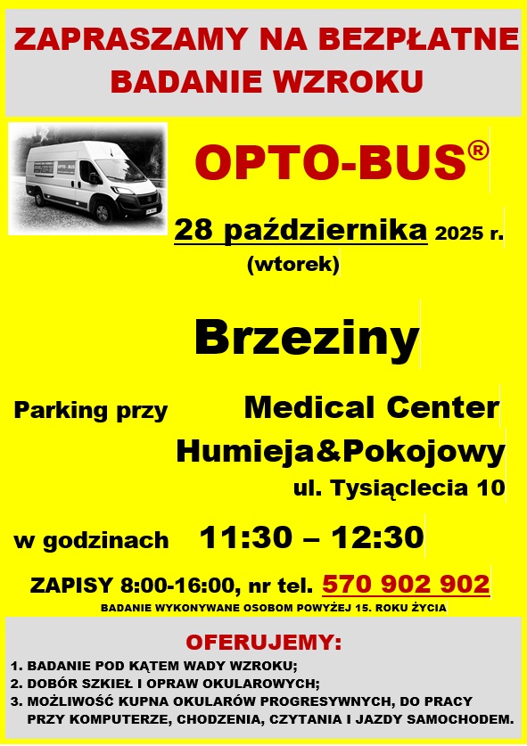 Badania zostaną przeprowadzone w mobilnym gabinecie OPTO-BUS®, który będzie dostępny: