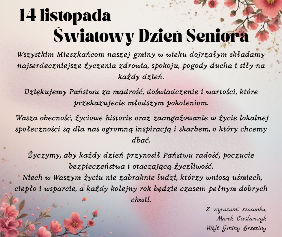 Z okazji Światowego Dnia Seniora, obchodzonego 14 listopada, pragniemy wyrazić naszą wdzięczność i uznanie wszystkim Seniorom z Gminy Brzeziny.