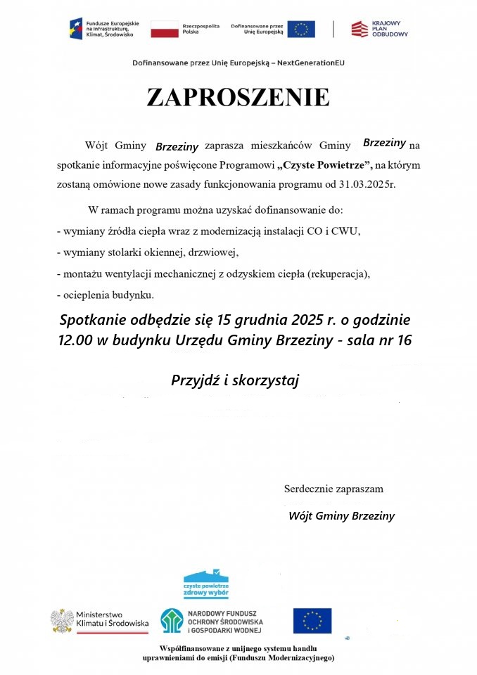 Wójt Gminy Brzeziny zaprasza mieszkańców na spotkanie informacyjne poświęcone Programowi „Czyste Powietrze”, podczas którego omówione zostaną aktualne zasady funkcjonowania programu obowiązujące do 31 marca 2025 r.