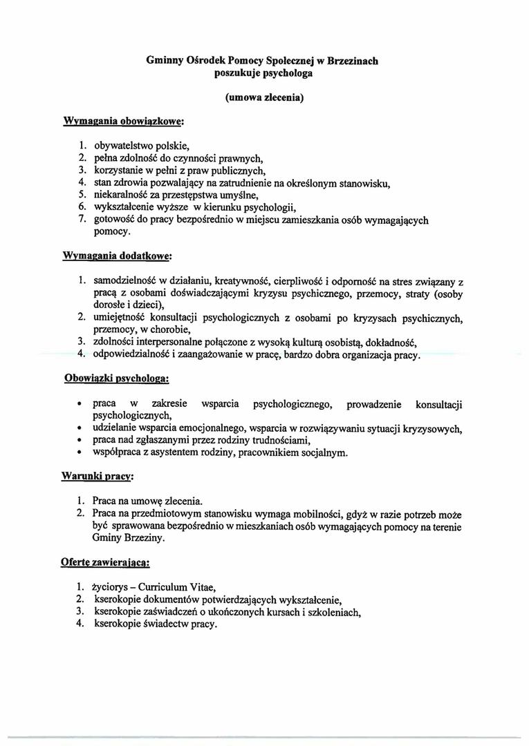 Gminny Ośrodek Pomocy Społecznej w Brzezinach poszukuje psychologa - szczegóły w załączniku