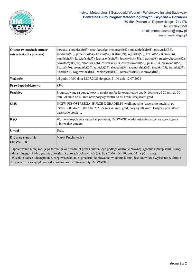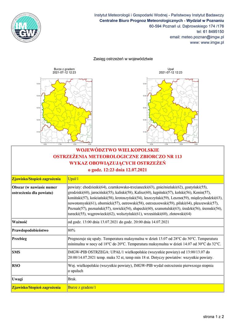 12.07.2021 r. - ostrzeżenie meteorologiczne - burze z gradem