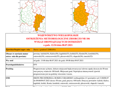 • ostrzeżenie meteo dla województwa wielkopolskiego burze z gradem powiat kaliski od godz. 09:00 dnia 12.07.2021 do godz. 21:00 dnia 12.07.2021