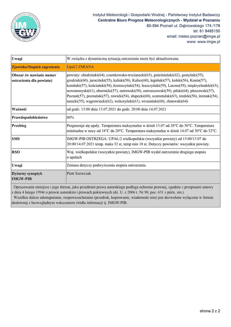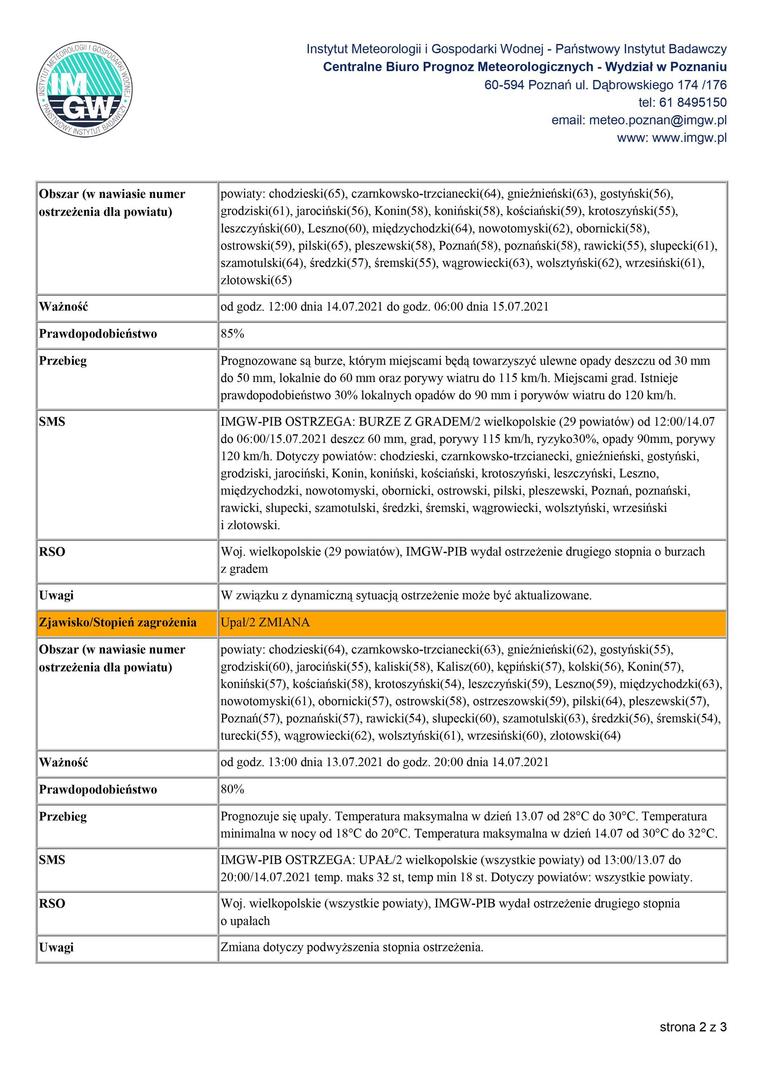 14.07.2021 r. ostrzezenie meteorologiczne - burze z gradem