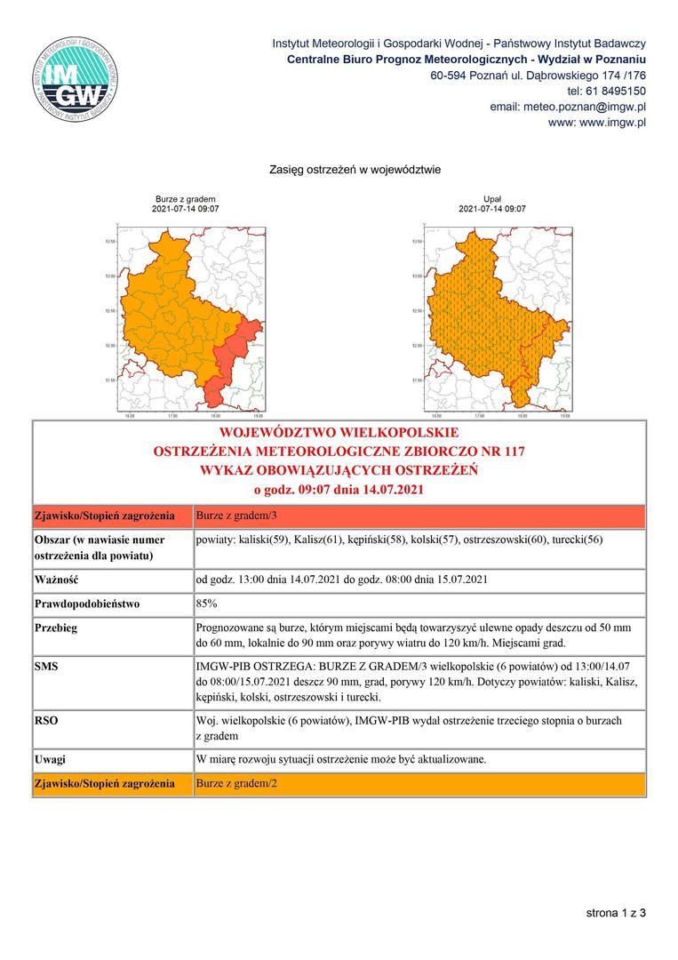 • ostrzeżenie meteo dla województwa wielkopolskiego burze z gradem powiat kaliski od godz. 09:00 dnia 12.07.2021 do godz. 21:00 dnia 12.07.2021