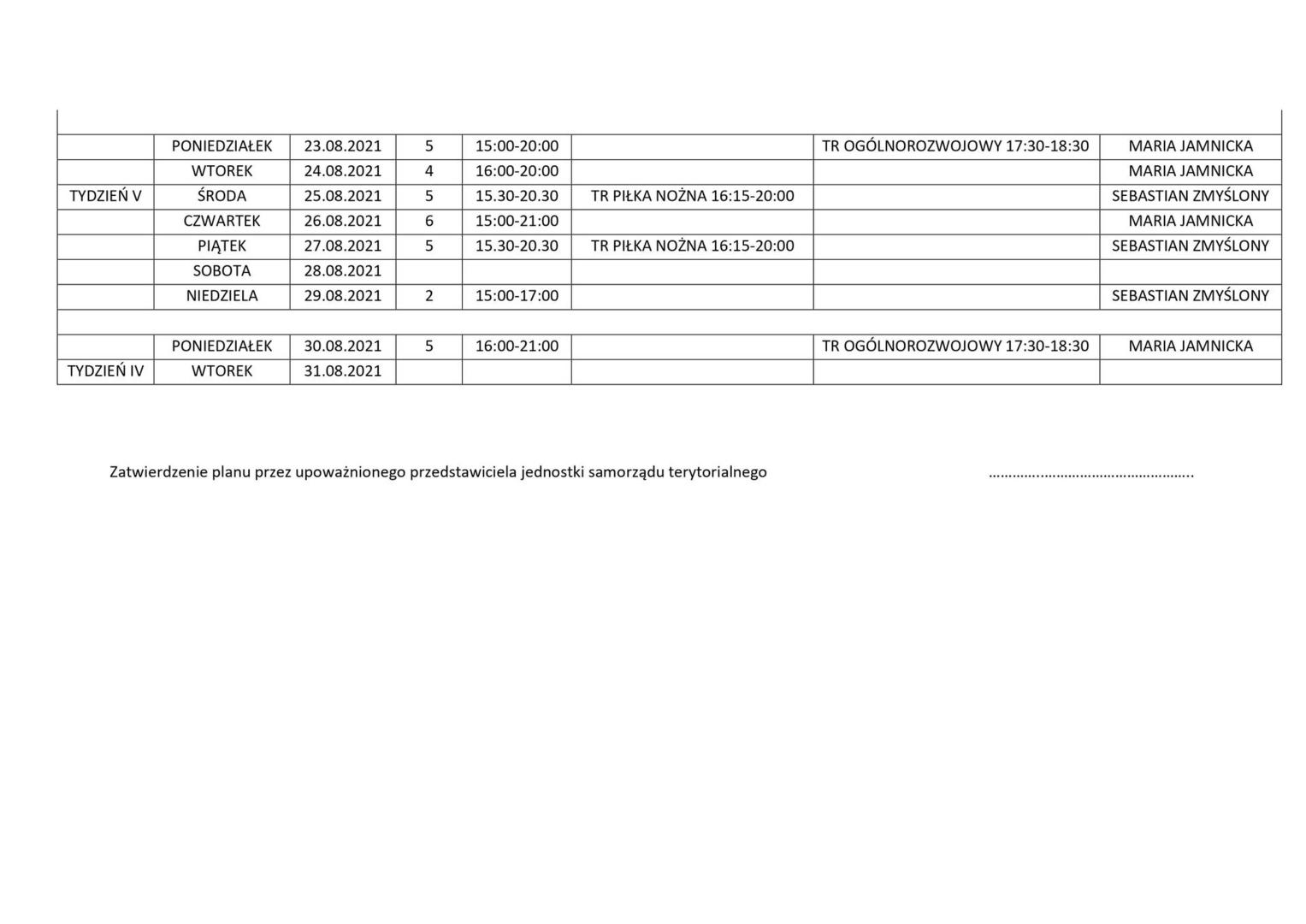 • Harmonogram zajęć na boisku Orlik w Brzezinach - sierpień 2021.