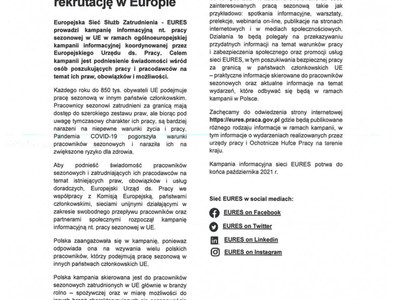 Obecnie na portalu EURES-u https://eures.praca.goy.pl w zakładce „Kampania nt. pracy sezonowej w UE 2O21 zamieszczone są przydatne informacje nt. pracy sezonowej w Niemczech - kraju w którym najczęściej podejmują pracę sezonową Polacy. Zawarte są tam informacje dot. Pracy w rolnictwie, praw pracownika budowlanego, kierowcy ciężarówki, czy też informacje dla pracowników branży hotelarsko — gastronomicznej. Z analizy tych dokumentów można się dowiedzieć w jakiej formie zawierana jest umowa, jaki jest tygodniowy czas pracy, jakie obowiązują przerwy w czasie pracy, jakie jest minimalne wynagrodzenie za pracę czy istnieją okresy wypowiedzenia umowy o prace itp. Można również dowiedzieć się o sposobach i możliwościach zgłaszania naruszeń praw pracowniczych w państwie zatrudnienia.