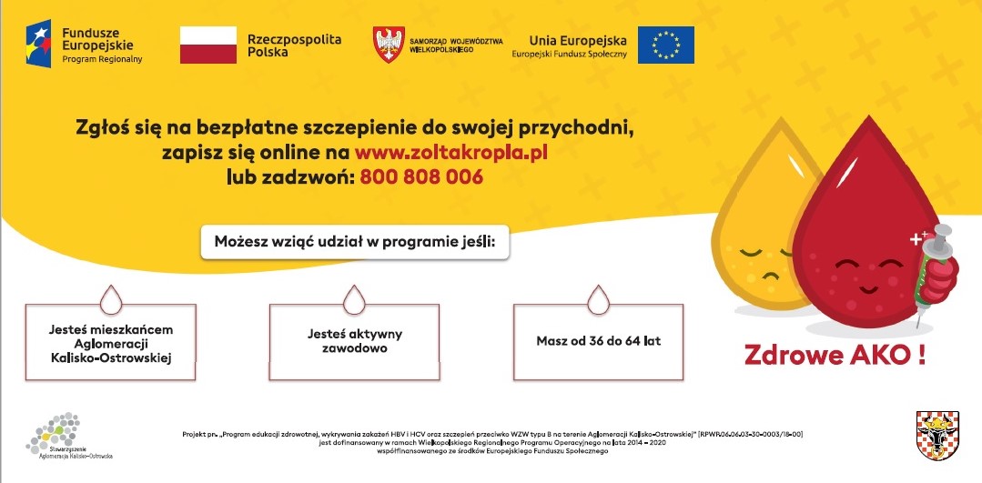 Projekt „Program edukacji zdrowotnej, wykrywania zakażeń HBV i HCV oraz szczepień przeciwko WZW typu B na terenie Aglomeracji Kalisko - Ostrowskiej” współfinansowany jest ze środków Europejskiego Funduszu Społecznego w ramach Wielkopolskiego Regionalnego Programu Operacyjnego na lata 2014-2020.