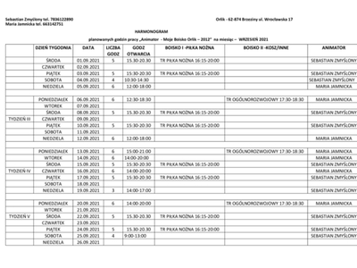Harmonogram zajęć na boisku Orlik w Brzezinach-listopad