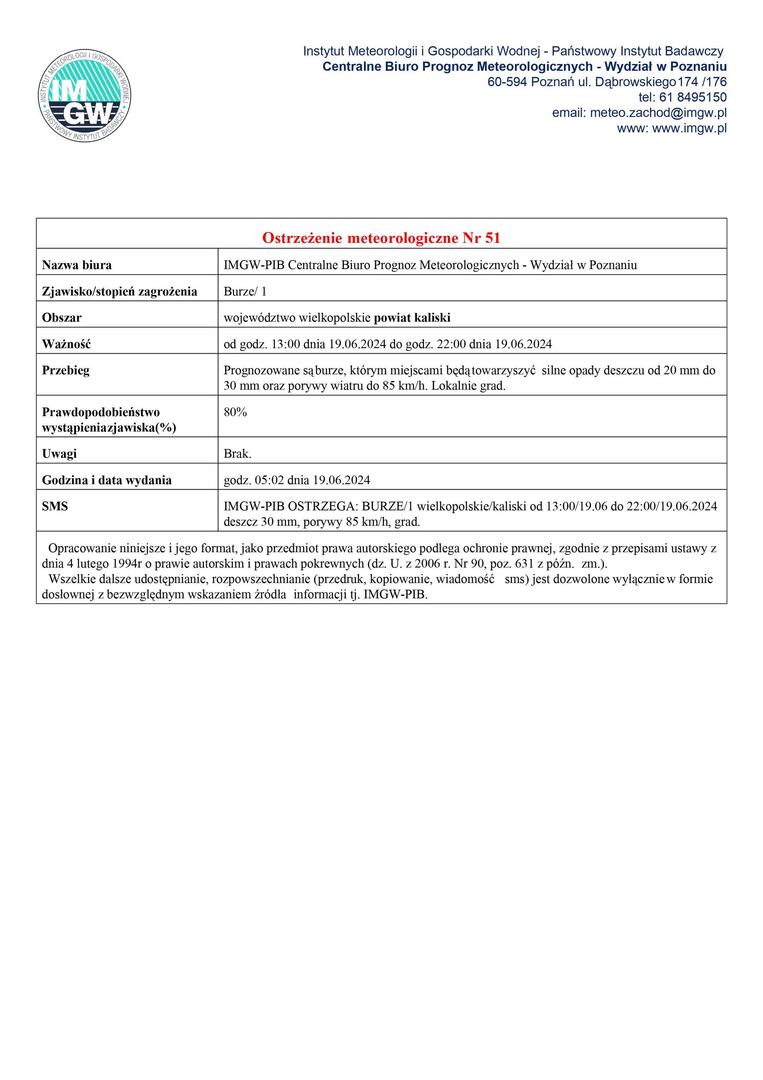 Ostrzeżenie obowiązuje od godz. 13:00 dnia 19.06.2024r. do godz. 22:00 dnia 19.06.2024r.